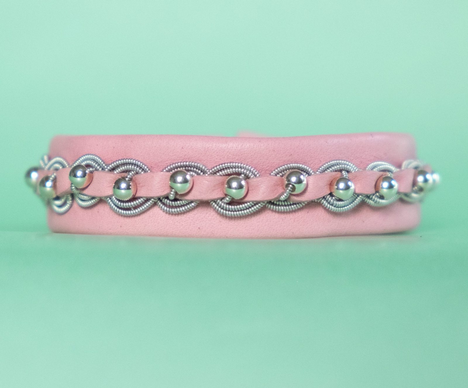 The bracelet ATSUKO is made of light pink reindeer leather from Sweden and tin thread with larger silver beads (925). Swarovski-style glass button as clasp.