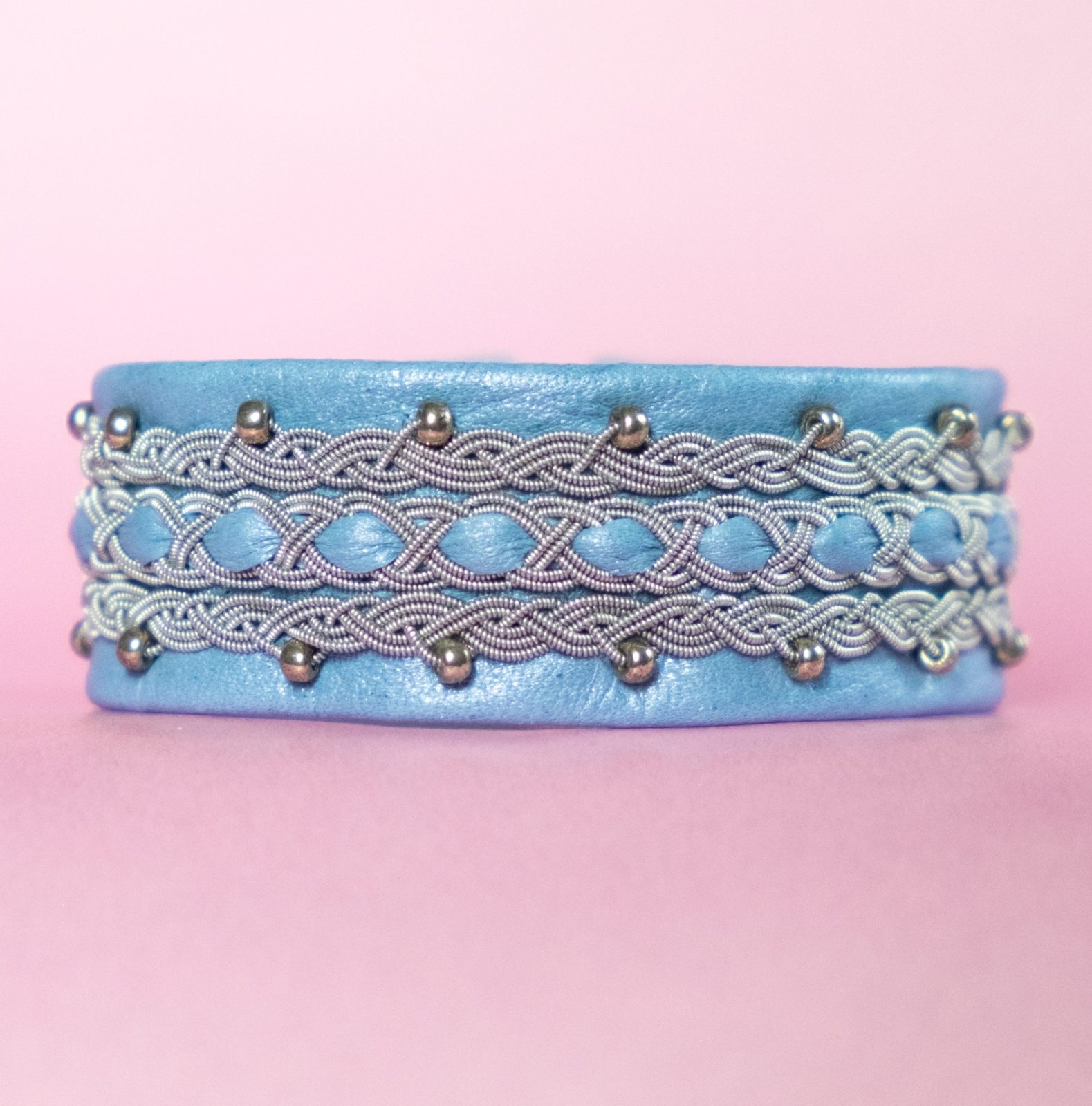 The bracelet INGA-LILL is made of light blue reindeer leather from Sweden and tin thread with silver beads (925). Genuine Swarovski crystal button as clasp.