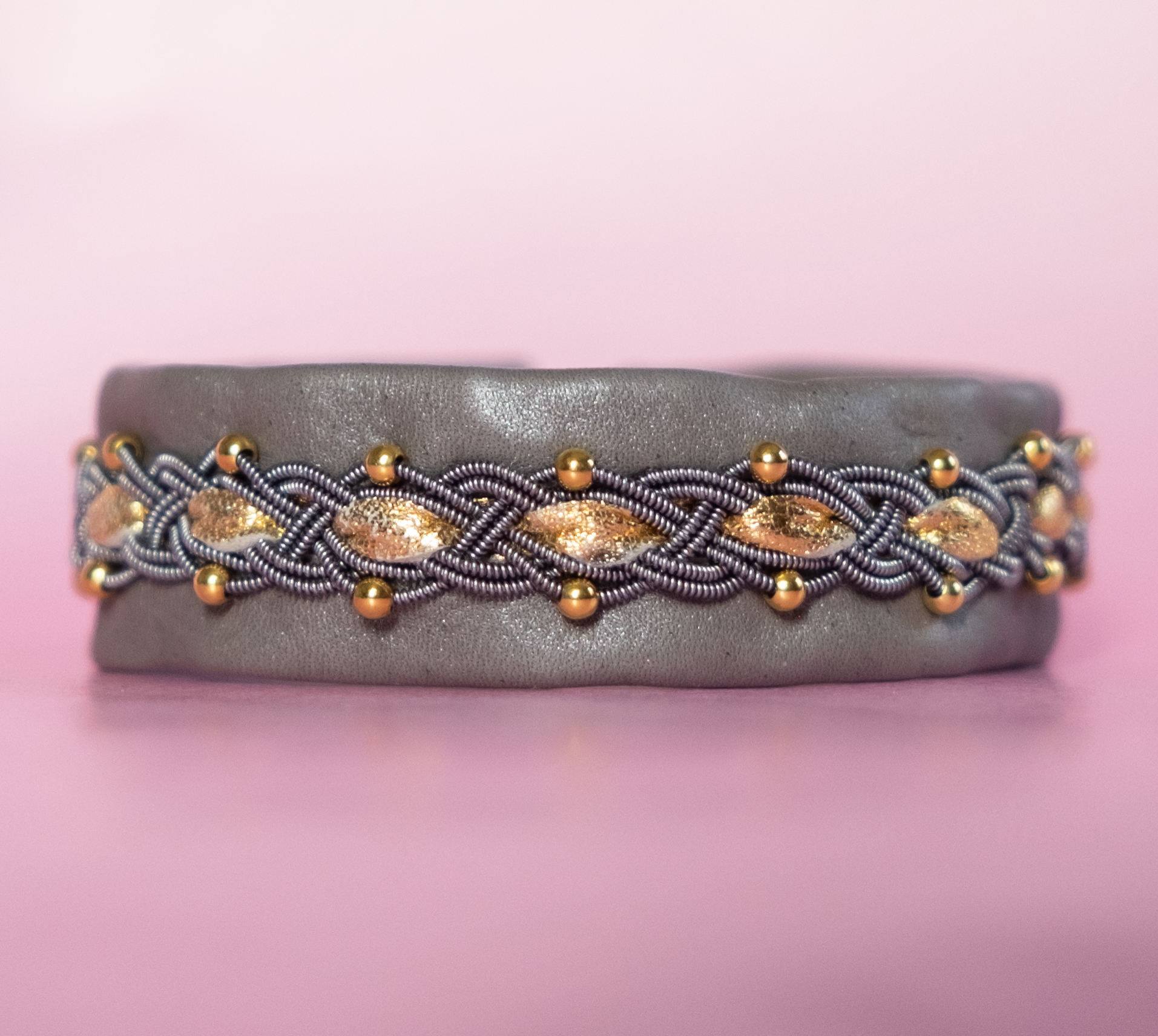 The bracelet LAURA is made of grey reindeer leather from Sweden. The braid is made of darker grey copper thread, with gold-plated pearls and leather details. A genuine Swarovski button and leather string as claps.
