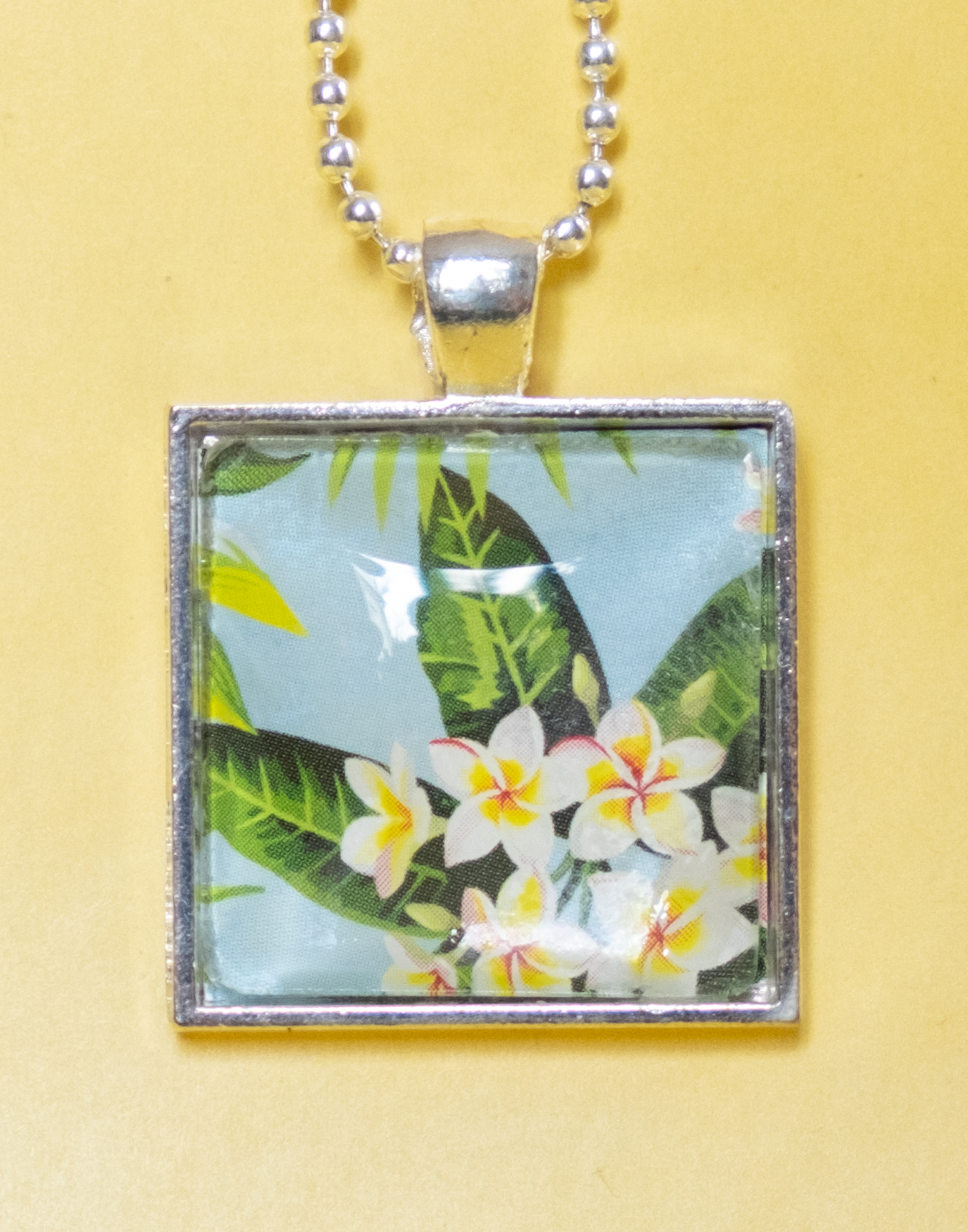 The frame is square and measures approx. 0.9″ x 0.9″, including the bail the length is 1.1″. The pendant is sold without chain, but if you want to add a silver-coloured ball chain in any length, then contact me before the purchase.