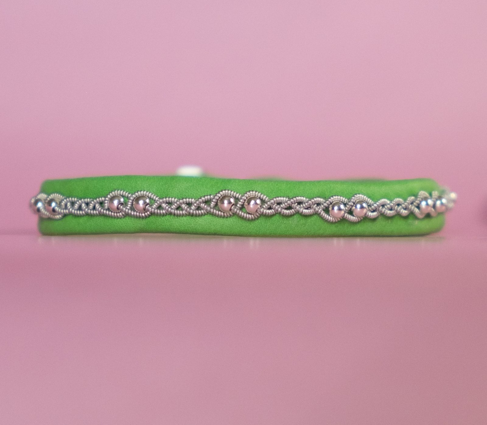 The bracelet MAJA is made of bright green reindeer leather from Sweden and tin thread with silver beads (925). Genuine Swarovski crystal button as clasp.