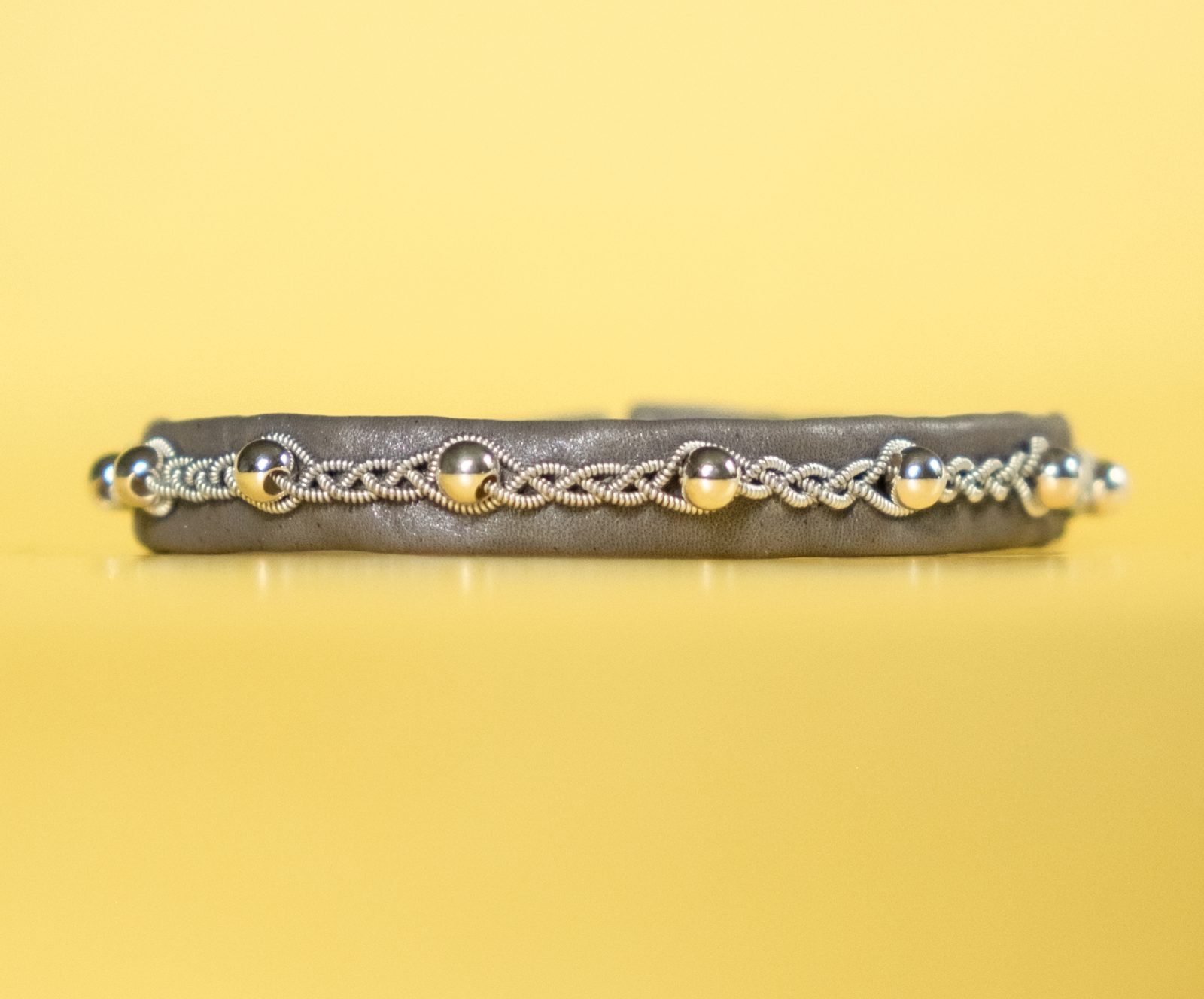 The bracelet MURIEL is made of grey reindeer leather from Sweden and tin thread with silver beads (925). Genuine Swarovski crystal button as clasp.