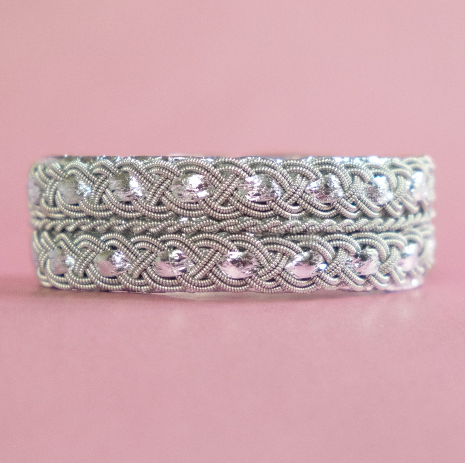The bracelet PAULINA is made of silver-coloured reindeer leather from Sweden with tin thread and silver-coloured details. Swarovski-style glass button as clasp.