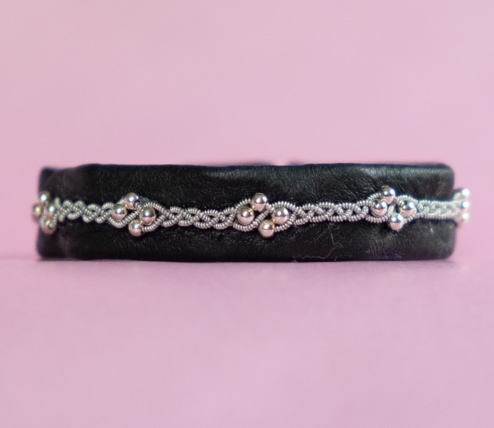 Armbandet KAI är gjort av svart renskinn från Sverige och tenntråd med silverpärlor (925). Kolsvart äkta Swarovskiknapp och skinnsnodd som stängning.