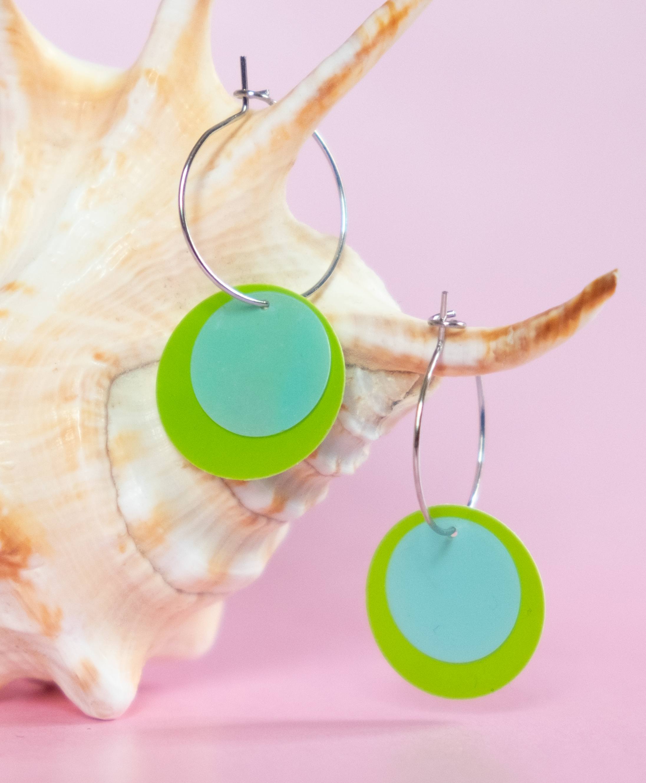MARY Q-3 är ett kreolörhänge av silverfärgad metalltråd med två paljettplattor i olika storlekar. Den stora är gräsgrön och den mindre ljusblå. Enkelt och snyggt, mycket 60-talskänsla.